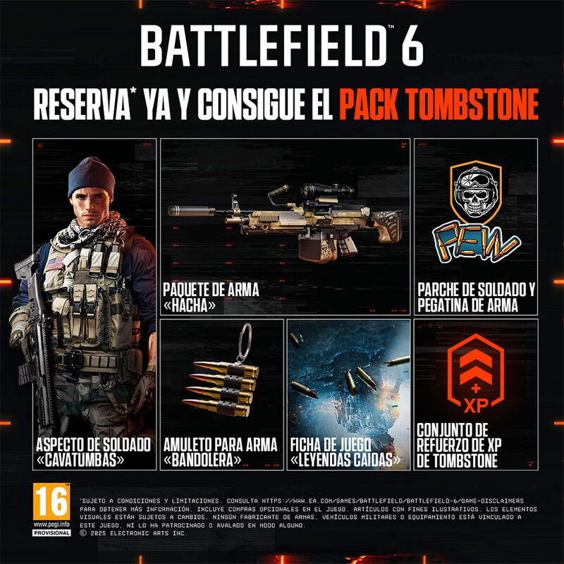 Esta es tu guerra. Toma el control antes de pasar al frente. Reserva Battlefield 6 y consigue el pack Tombstone. Incluye un aspecto de soldado, paquete de armas, conjunto de refuerzo de XP de Tombstone, ficha de juego, parche de soldado y más.