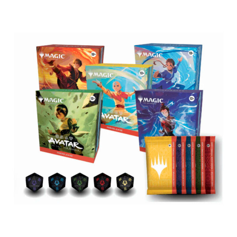 Elige uno de los cinco Packs de Presentación de proporción especial y comienza tu aventura con Magic: The Gathering | Avatar: La Leyenda de Aang. Cada Pack Prerelease MTG Avatar Aang contiene 5 sobres de juego, 1 sobre de personaje de proporción especial basado en un personaje concreto de la serie y un color de Magic, 2 fichas no foil de dos caras según el color, 1 carta rara o rara mítica foil tradicional con el año estampado y 1 dado Spindown temático. ¡Ideal para jugadores mayores de 13 años que buscan coleccionar, jugar y dominar los elementos en este crossover legendario!