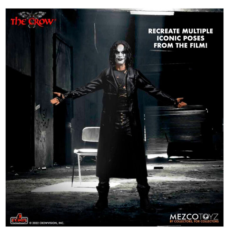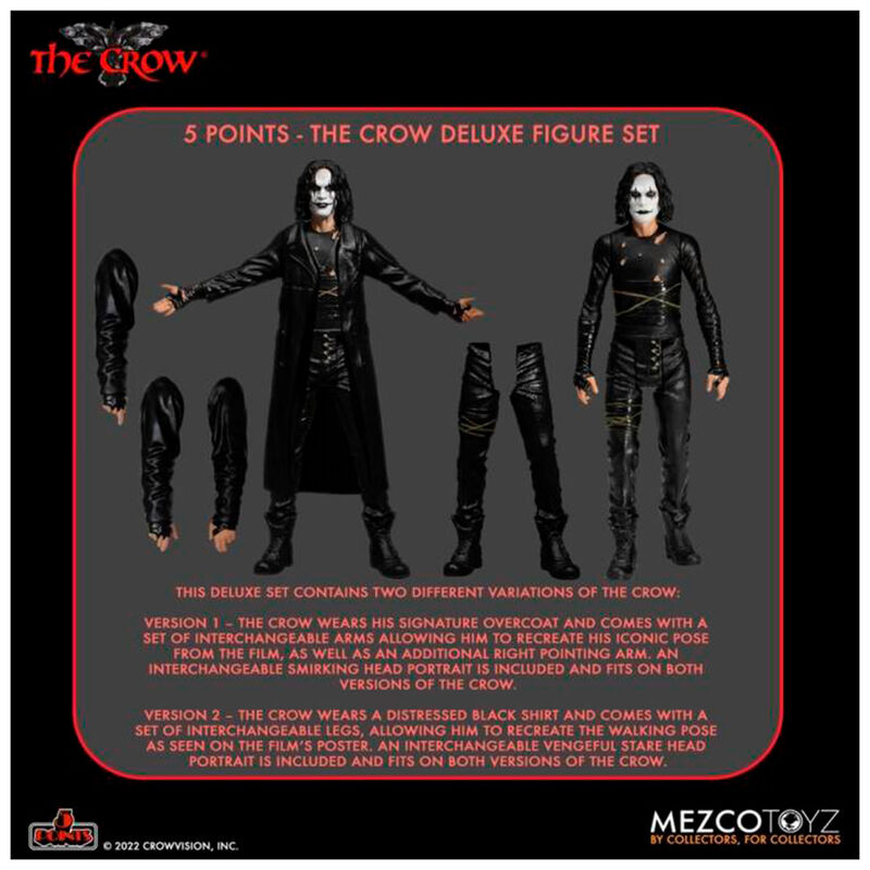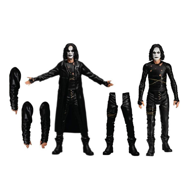 Mezco Toyz, dentro de su nueva colección 5 points XL presenta este de 2 figuras de la película "El cuervo". Incluye una figura de 9 cm. de altura del protagonista vestido con gabardina y otra figura del mismo tamaño vestido sin ella. Además contine 3 brazos y 2 piernas adicionales. Se presentan en una caja sin ventana.