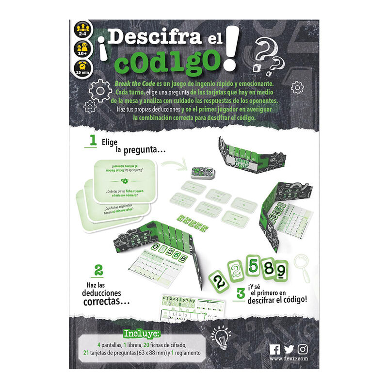 En Break the code, cada jugador trata de deducir los códigos que oculta el resto de jugadores tras sus pantallas. Claves de Venta: 1. Se explica en 5 minutos y se juega en 15, ¡pero no vas a poder echar solo una! 2.Una vuelta de tuerca modernizada a clásicos de la deducción lógica como el Mastermind. 3. Ideal para los amantes de los Escape Rooms con candados. Mecanicas: Deducción, papel y lápiz, información oculta
