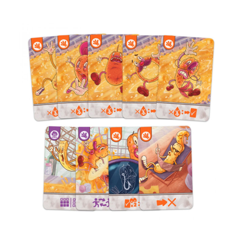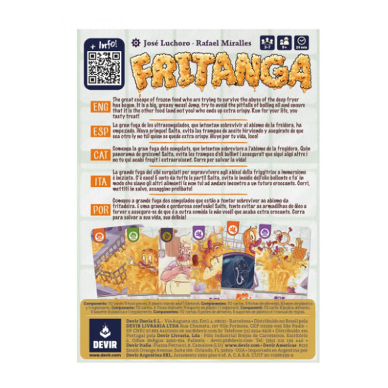 Ambientado en el universo de Blind Business, Fritanga es un juego para amantes de la cocina donde la zona de juego es… ¡una freidora! Los jugadores toman el control de varios alimentos e intentan sobrevivir a toda costa, saltando de un lado a otro de la cesta de la freidora. Cuando un jugador no puede moverse, cae en el aceite hirviendo, se fríe y (desafortunadamente) se elimina del juego. Debes utilizar todas las cartas que recojas para sobrevivir y no quedar deliciosamente maltratado. Fritanga tiene tres modos de juego: todos contra todos, apto para 2 a 6 jugadores; el modo contra el chef, una versión semi-cooperativa para grupos de 3 a 7 jugadores, en el que uno será el chef e intentará freír al resto de jugadores; y el modo por equipos, en el que dos grupos iguales compiten para ganar. Cada modo de juego tiene algunas cartas diferentes para personalizar la experiencia. Tras preparar la zona central de juego con una matriz de varias columnas y filas de cartas, que representan espacios en la cesta de la freidora, los jugadores comienzan sus turnos, que se dividen en dos fases: jugar cartas y moverse. La primera fase te permite jugar tantas cartas como quieras, con el objetivo de mejorar la posición en la freidora o molestar y atacar a tus rivales. La segunda fase te permite alejarte 1-2 cartas. En ese momento, se revela la carta que alcanzaste y luego se activa un efecto o puedes reclamar esa carta para usarla más tarde.
