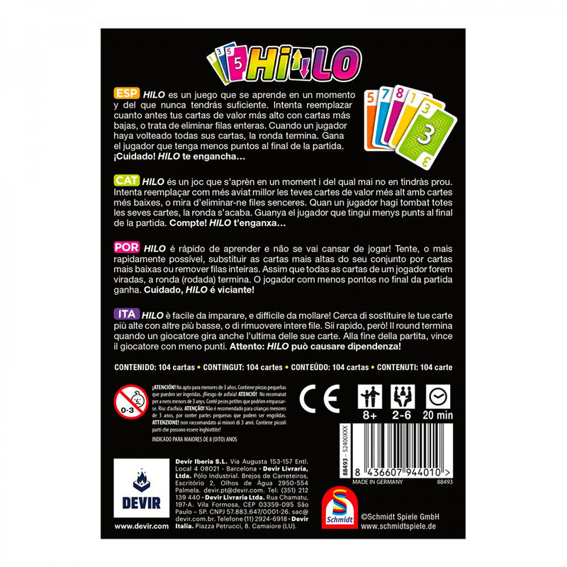 HILO es un juego que se aprende en un momento y del que nunca tendrás suficiente. Intenta reemplazar cuanto antes tus cartas de valor más alto con cartas más bajas, o trata de eliminar filas enteras. Cuando un jugador haya volteado todas sus cartas, la ronda termina. Gana el jugador que tenga menos puntos al final de la partida. Obra de Eilif Svensson y Knut Stromfors, HILO se puede disfrutar en pareja o en grupos de hasta 6 jugadores, a partir de 8 años, en partidas de unos 20 minutos de duración. Este juego de cartas adictivo y frenético consta de varias rondas y se acaba cuando un jugador alcanza los 100 puntos. Cada jugador intenta reemplazar las cartas de su matriz que tienen un valor alto por cartas de valor más bajo, o incluso eliminar filas enteras. Gana el jugador que tenga menos puntos al final de la partida. HILO es muy fácil de aprender: ¡el reglamento solo tiene 4 páginas! Al principio de la partida, cada jugador coloca nueve cartas boca abajo sobre la mesa, delante de él/ella, formando una matriz de 3×3. Con las cartas restantes se forma un mazo boca abajo, que se coloca en el centro de la mesa. Se revela la carta superior y se deja boca arriba junto al mazo: esta será la primera carta de la pila de descarte. A continuación, cada jugador revela dos cartas cualesquiera de su matriz. Empieza a jugar quien tenga la suma más alta en sus dos cartas reveladas. ¿Fácil, verdad? En su turno, los jugadores deben elegir una de las dos acciones disponibles: tomar la carta superior (boca arriba) de la pila de descarte o bien tomar la carta superior (boca abajo) del mazo. En el segundo caso, pueden optar por descartar directamente la carta tomada, pero siempre deberán revelar una carta de su matriz. A lo largo de la partida, los jugadores pueden formar un HILO si consiguen una fila de tres cartas del mismo color en su matriz. Después de que un jugador haya volteado todas las cartas de su matriz (o si un jugador se ha quedado sin cartas en la matriz al final de su turno), cada uno de los demás jugadores jugará exactamente un turno más. Luego, todos los jugadores revelarán las cartas que aún tengan boca abajo en su matriz. Si así se forma algún HILO, los jugadores eliminan las cartas de la manera habitual. Por último, cada jugador suma el valor de todas las cartas que le queden en su matriz. ¡Pero cuidado! Si el jugador que ha provocado el final de la ronda no tiene la suma más baja, deberá duplicar sus puntos en esa ronda (excepto si la suma es un número negativo). Deberá duplicar sus puntos incluso aunque otro jugador tenga la misma suma de puntos. La partida termina cuando, al final de una ronda, al menos un jugador tenga un total de más de 99 puntos (entre todas las rondas). Gana el jugador que tenga un total de puntos más bajo. Si dos o más jugadores empatan a menos puntos, comparten la victoria. Fácil de aprender, dinámico, rápido y divertido, HILO enamorará a los jugadores casuales y a los amantes de los juegos de cartas. Sin embargo, es nuestro deber advertiros de algo: este juego engancha.