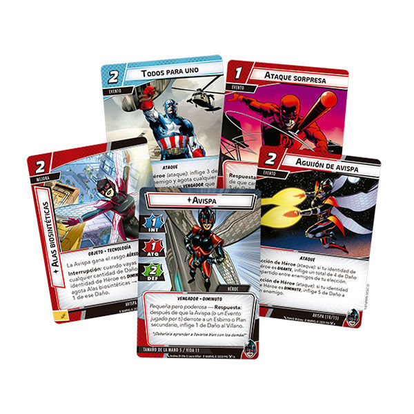 A partir de las mismas capacidades cambiantes que el Hombre Hormiga, la Avispa demuestra contar con sus propias y personalísimas tácticas que priorizan una preparación cuidadosa para poder ejecutar sus planes sin problemas y finalmente asestar el golpe maestro. Este pack de Héroe incluye un mazo pregenerado de 40 cartas con el aspecto Agresividad listo para poder jugar directamente. Tanto si estás deseando entrar en acción como Avispa como si quieres añadir nuevas cartas a tus otros Héroes, verás que hay mucho con lo que poder disfrutar en esta expansión.
