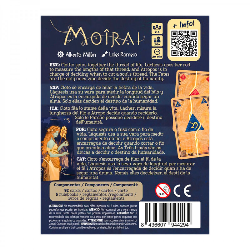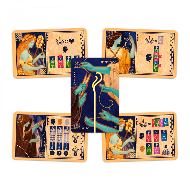 Las Moirai (a menudo llamadas Las Tres Parcas, en inglés) son diosas de la mitología griega. Han puesto en marcha su rueca para tejer el destino de la humanidad. Cloto teje el hilo de la vida, Lachesis usa su vara para medir la longitud de ese hilo y Atropos se encarga de decidir cuándo cortar el hilo de un alma. Diseñado por Alberto Millán e ilustrado por Loles Romero, Moirai es un juego de cartas en el que pueden participar de 2 a 4 jugadores, a partir de 10 años, que ofrece partidas de entre 20 y 30 minutos. Para ganar deberás sumar la mayor cantidad de puntos según las condiciones que indiquen las tres cartas de moira que se roban durante la preparación de la partida. A las órdenes de las tres Moirai, los jugadores deberán crear un telar con cartas en el que se tejerán varias vidas. En su turno, los jugadores eligen quedarse con una carta o tomar una pila entera descartada y colocar todas esas cartas en su telar. Al final del juego, los jugadores obtendrán puntos según los criterios de puntuación de las cartas de Clotho, Lachesis y Atropos. Gana quien lo haga mejor. Moirai forma parte de la colección pocket de Devir, que se caracteriza por traer grandes juegos en formato reducido y con un coste económico. Además de su portabilidad, que los hace unos grandes compañeros de viaje, son títulos versátiles al alcance de todos los públicos. Las partidas a Moirai se resolverán en muy poco tiempo y es muy posible que encadenéis una partida tras otra.