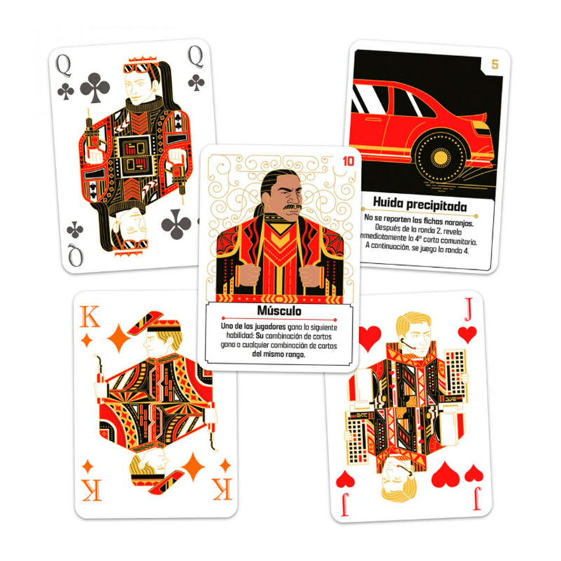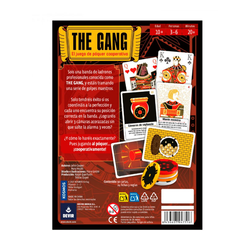 Sois una banda de ladrones profesionales conocida como ‘The Gang’, y estáis tramando una serie de golpes maestros. El éxito de estos golpes depende de la perfecta coordinación de toda la banda. Para ganar la partida, tendréis que cooperar para abrir tres cámaras acorazadas sin que salte la alarma tres veces. ¿Y cómo lo haréis exactamente? Pues jugando al póquer... ¡Cooperativamente! The Gang se basa en el póquer, más concretamente en la variante Texas Hold’em. Si ya conoces las reglas del Texas Hold’em, te resultará más fácil aprender y jugar a The Gang. Sin embargo, incluso los más principiantes pueden aprender a jugar muy rápido, ya que los fundamentos del póquer son muy sencillos. A diferencia del juego clásico, aquí no hará falta marcarse faroles, ya que todos los jugadores colaboran. El verdadero reto se encuentra en saber interpretar qué jugadas tienen el resto de los compañeros. Diseñado por John Cooper y Kory Heath, The Gang permite partidas para grupos de 3 a 6 personas, a partir de 10 años, de unos 20 minutos de duración. Una partida de The Gang consta de 3 a 5 golpes. Cada golpe consta de 4 rondas, seguidas de la fase de Revelar. Al final de cada golpe, comprobaréis si habéis tenido éxito o no. Ganáis la partida si tenéis éxito en 3 golpes. Perdéis si fracasáis 3 veces. Al principio de cada ronda, todos los jugadores reciben dos cartas, que forman su mano. A continuación, los jugadores deberán tomar una de las fichas blancas disponibles, que muestran un número variable de estrellas (de 1 al número que corresponda, según las personas que jueguen la partida). Estas fichas son el medio de comunicación a través del cual los jugadores comunican su estimación de la fuerza de su combinación de cartas. Es decir, si tomas la ficha con más estrellas, estás indicando que crees que tienes la combinación de cartas más fuerte de la mesa. Si tomas la ficha con 1 estrella, crees que tienes la combinación de cartas más débil. No hay orden de turno y los jugadores pueden intercambiar las fichas tantas veces como quieran durante el turno. En las siguientes rondas, se añadirán cartas al centro de la mesa (como en el Texas Hold’em) y se repartirán fichas de nuevo hasta 3 veces más. Al final, si las estimaciones son correctas, el golpe habrá tenido éxito. El juego incluye tres modos de dificultad extra: avanzado, profesional y maestro del crimen, para los jugadores que busquen retos de mayor calibre. En estos modos entran en juego las cartas de desafío y de especialista. ¿Estáis preparados para dar un golpe maestro?