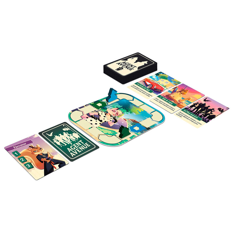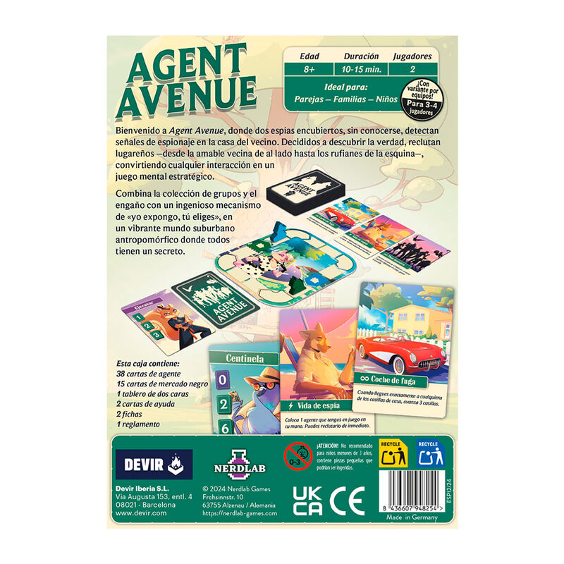 La Agent Avenue es algo más que una calle tranquila: es un campo de batalla secreto para el espionaje. Dos espías, que son vecinos y desconocen la verdadera identidad del otro, empiezan a detectar señales de que no son residentes normales y corrientes. Motivados por tales indicios, usan sus habilidades de espionaje para descubrir la verdad sobre quién vive en la puerta de al lado. Diseñado por Laura y Christian Kudahl e ilustrado por Fanny Pastor-Berlie, Agent Avenue se puede disfrutar en pareja o en grupos de hasta 4 jugadores, a partir de 8 años, en partidas de unos 15 minutos. El objetivo del juego consiste en desenmascarar la identidad secreta de tu rival (o del equipo rival, en caso de jugar por equipos) atrapando su ficha en el tablero antes de que él atrape la tuya. El componente principal del juego son las cartas, que representan a otros vecinos y a espías que trataremos de aprovechar a nuestro favor. En cada turno, los jugadores pondrán dos cartas sobre la mesa, una boca arriba y la otra boca abajo. El oponente elegirá una de ellas y a continuación ambos jugadores colocarán su carta en su zona de juego. En función del número de cartas de cada tipo que tenga cada jugador, podrán avanzar o retroceder su ficha en el tablero central. Si al final del turno una focha ha atrapado la otra, se acaba la partida. ¡Así de simple es jugar a Agent Avenue! El reto del juego se encuentra en qué cartas elegir de las 4 disponibles para poner sobre la mesa en el turno de cada jugador. La criptógrafa, por ejemplo, nos dará la victoria de forma automática si conseguimos acumular tres copias de su carta. El saboteador, por otro lado, nos hace retroceder, de modo que habrá que intentar que sea nuestro rival quien tome esa carta. Si se te da bien el faroleo, seguro que disfrutarás con Agent Avenue. Además, el juego incluye un mazo de cartas de mercado negro pensado para partidas avanzadas. Estas cartas dan acceso a nuevos recursos y eventos que proporcionarán a los jugadores beneficios y tácticas avanzadas. ¿Preparado para pensar como un espía mientras actúas como un amable vecino?