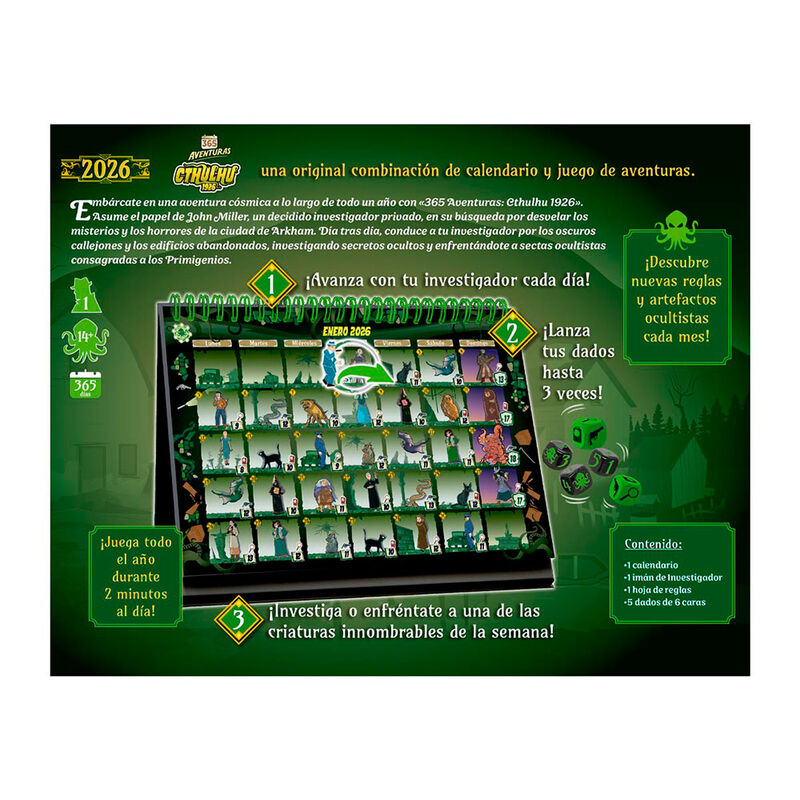 ¡Embárcate en una aventura cósmica a lo largo de un año! Día a día, asume el papel de John Miller, un decidido investigador privado, en su búsqueda por desvelar los misterios y los horrores de la ciudad de Arkham. Te enfrentarás a los retos tirando los dados y eligiendo qué casillas investigar. ¡Nunca un calendario había sido tan divertido!