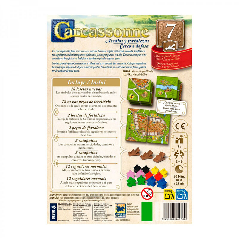 ¡La guerra azota Carcassonne! Esta expansión incluye 18 nuevas losetas de territorio con símbolos de asedio, que acaban desembocando en los ataques contra la ciudadela. También añade dos piezas dobles de fortaleza, donde los jugadores deberán asignar a sus trabajadores en los puestos de defensa, tres peones de catapulta, que atacarán las ciudades, los caminos y los monasterios, y 12 peones de seguidor normal, dos por jugador, que se añaden a la reserva de trabajadores disponibles.