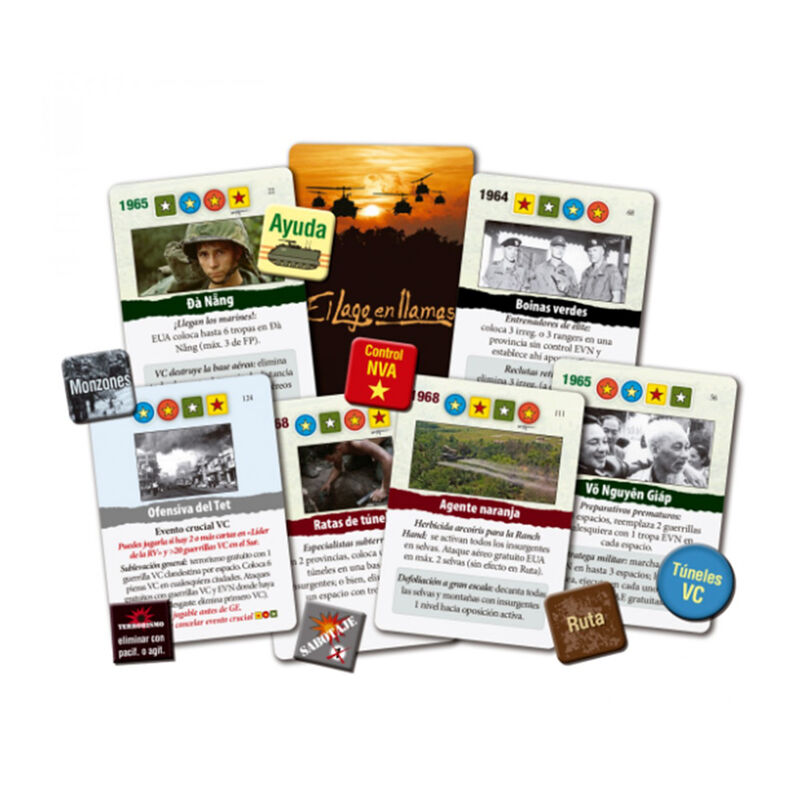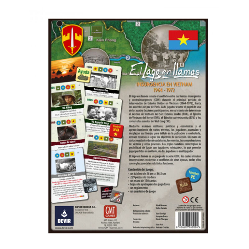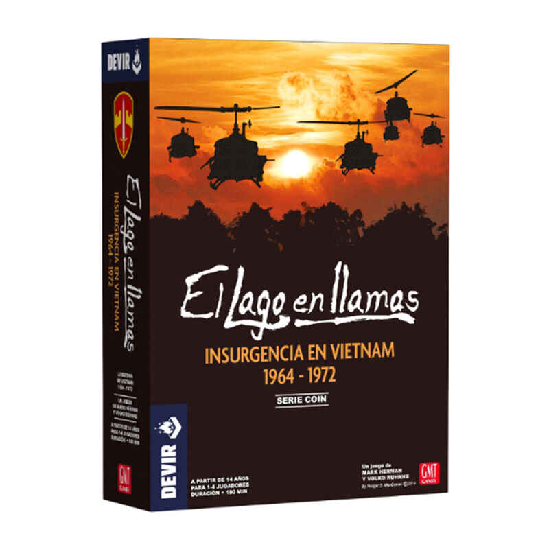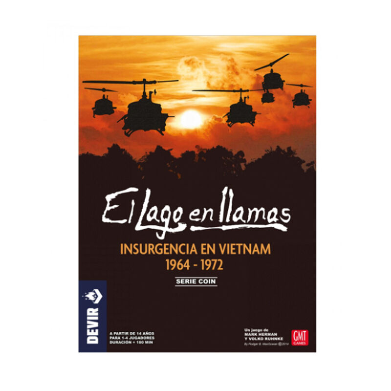 Uno de los puntos más calientes de la Guerra Fría ocurrió en el sudeste asiático a finales de los años sesenta del siglo pasado, como consecuencia del proceso de descolonización en la Indochina francesa. Vietnam se dividió en dos países (uno procomunista, al norte, y otro afín a las potencias occidentales, al sur). Ante el temor de que el sur cayera bajo influencia comunista, Estados Unidos destinó ingentes esfuerzos militares para armar el país, enzarzándose en un conflicto que marcó a varias generaciones. La guerra del Vietnam ha sido tratada en el cine (Apocalypse Now, Platoon, Full metal jacket), la literatura y también en el mundo de los juegos de mesa. Diseñado por Mark Herman y Volko Ruhnke, El lago en llamas es un juego de mesa para 1 a 4 jugadores que simula el conflicto entre las fuerzas insurgentes y contrainsurgentes (COIN) durante el principal período de intervención de Estados Unidos en Vietnam (1964-1972), hasta los acuerdos de paz de París. Cada jugador asume el papel de una de las cuatro facciones participantes, en su intento de determinar el destino de Vietnam del Sur: Estados Unidos (EUA), el Ejército de Vietnam del Norte (EVN), el Ejército sudvietnamita (ESV) o los comunistas sureños del Viet Cong (VC). Mediante acciones militares, políticas y económicas y el aprovechamiento de varios eventos, los jugadores acumulan y desplazan sus fuerzas para influir en la población o controlarla, extraer recursos o lograr los objetivos de su facción. Un mazo de cartas regula el orden de cada turno, los eventos, las comprobaciones de victoria y otros procesos. Las reglas también contemplan la posibilidad de jugar con jugadores «virtuales», lo que permite jugar partidas en solitario o con menos de cuatro jugadores. El lago en llamas es el volumen IV de la serie de juegos COIN de GMT, todos ellos con reglas parecidas que sirven para simular insurrecciones modernas u otros conflictos de otras épocas, con la presencia de múltiples facciones. Con una mecánica principal de motor de cartas, este wargame nos sumerge de lleno en el conflicto, al mando de una de las 4 facciones asimétricas que lo protagonizaron. En tus manos está repetir la historia o cambiarla para siempre.