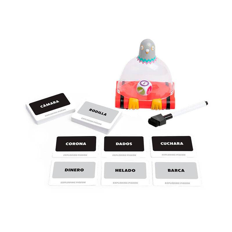 1 Paloma explosiva, 75 cartas, 1 rotulador borrable, 6 cartas de Ayuda