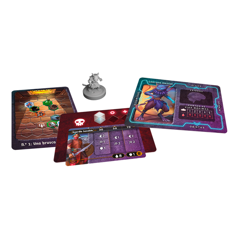 6 mercenarios diferentes, cada uno con una microminiatura, una carta de Personaje, 8 cartas de Capacidad de doble cara y mucho más, 22 cartas de Escenario con minimapas de batalla, 24 fichas de Estado, 10 cartas de Atributos de monstruo a doble cara con 20 enemigos distintos
