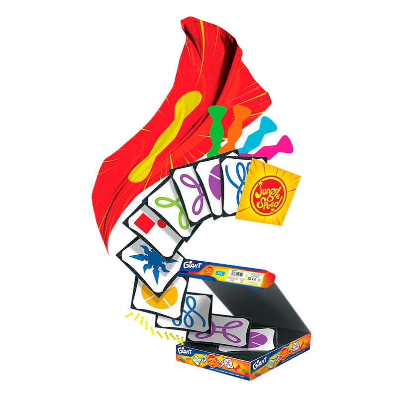 28 cartas gigantes, 4 bases de quipo, 1 bandera, 10 fichas de Tótem y 1 folleto de reglas