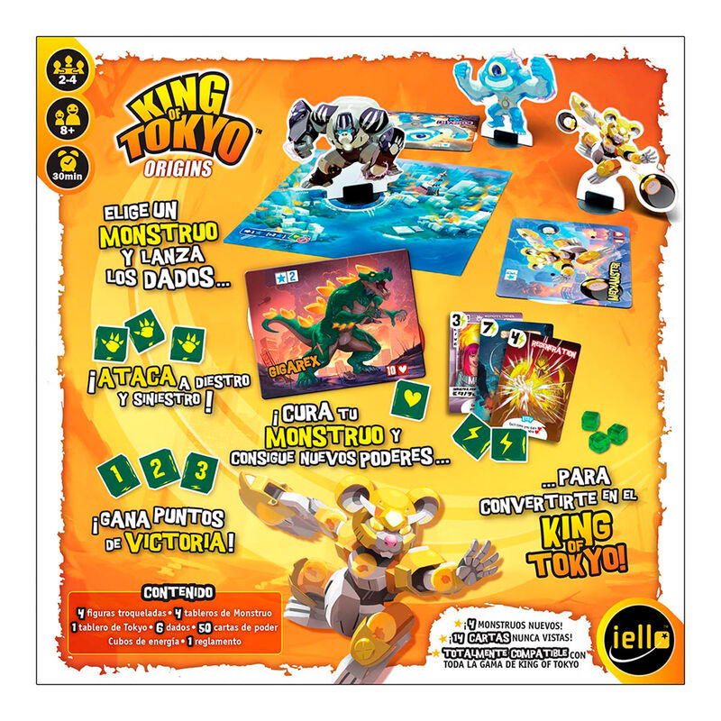 Obra del legendario Richard Garfield (creador de Magic The Gathering), King of Tokyo: origins está diseñado para 2 a 4 jugadores, a partir de 8 años, en sesiones de unos 30 minutos. Partidas cortas y de alto voltaje en las que los jugadores se convierten en un monstruo gigantesco, dispuesto a destruir cualquier cosa que se ponga por delante para convertirse en el rey de Tokyo. El primero que consiga 20 puntos de victoria o que elimine a todos sus rivales se alzará con la victoria.