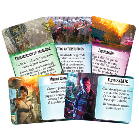 1 tablero de juego, 1 guía de referencia, 1 reglamento para aprender a jugar, 9 unidades de Humanos Primero, 9 unidades de Crimorg, 6 unidades de Segpriv, 6 hojas de Corporación, 16 cartas de Evento, 7 cartas de Rival, 6 cartas de Preparación, 9 cartas de Demanda, 12 cartas de Inversión, 34 cartas de Apoyo, 100 cartas de Acción, 6 cartas de Acción de emergencia, 1 ficha de Jugador activo, 1 ficha del Medidor de rondas, 14 fichas de Enfermedad, 14 fichas de Cortes, 14 fichas de Agitación, 14 fichas de Desarrollo, 1 ficha de Amenaza, 6 fichas de Capital, 5 fichas de Recurso, 5 fichas de Objetivo y 4 fichas de Androide.