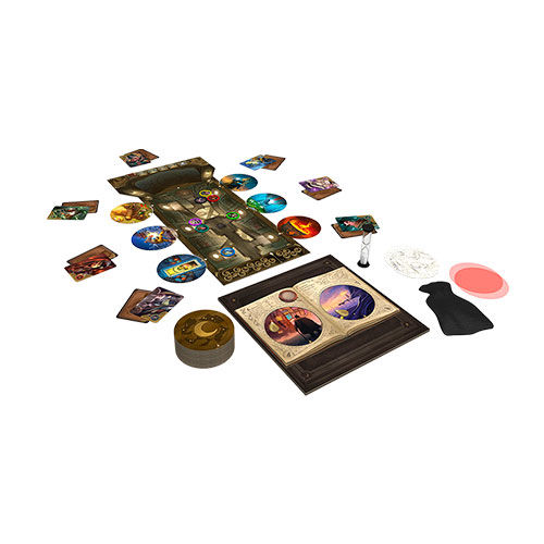 2 fichas de Mariposa, 84 cartas de Ilusión, 1 Libro, 1 tarjetero plegable con un marcador de Tiempo en el reverso, 1 tablero, 7 cartas de Lealtad (6x Leal y 1x Traidor), 7 fichas de Personaje, 7 cartas de Personaje, 4 filtros circulares de plástico, 1 indicador de Progreso, 1 reloj de arena, 1 bolsa, 14 fichas de Trampa, 30 fichas de Cohesión, 1 pieza de Sala evanescente y 1 libreto de reglas.