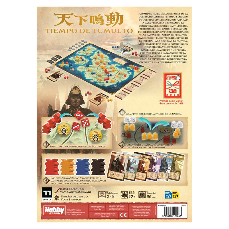 1 tablero, 11 fichas de castillo grande (valores 2-12), 11 fichas de castillo pequeño (valores 1-6), 4 fichas de espada (valores 4, 3, 2, 1), 72 peones de soldado (18 de cada en rojo, azul, amarillo y negro), 30 peones de refuerzo (blancos) 12 cartas de táctica, 6 caras de daimio, 12 dados (3 de cada en rojo, azul, amarillo y negro), 4 peones de daimio (1 de cada en rojo, azul, amarillo y negro) y 1 reglamento