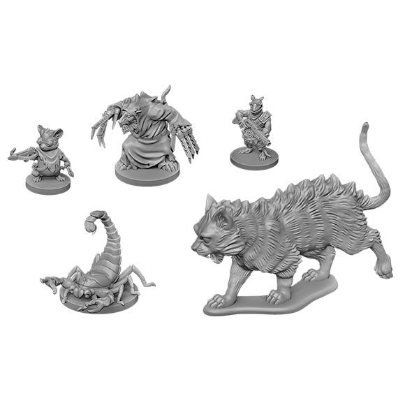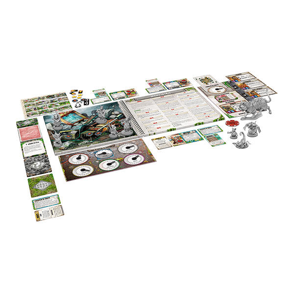 23 miniaturas de plástico, 2 dados de Resolución 1 tablero, 1 panel de control de campaña, 1 mapa de viaje del Centro, 162 cartas de tamaño estándar 88 cartas de tamaño pequeño, 88 fichas e indicadores, 7 figuras, 7 cajas de mazos, 1 reglamento y 1 libro de aventuras.