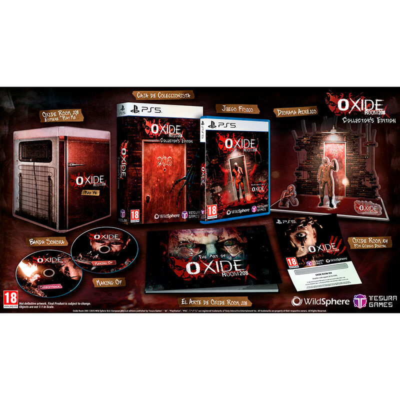 La Edición Coleccionista incluye: Juego OXIDE Room 208 en formato físico, Juego OXIDE Room 104 en formato digital, El Arte de OXIDE Room 208, Standee acrílico de Doc, Estuche “Play Me”, CD con la BSO del juego, Making Of del juego y Caja coleccionista