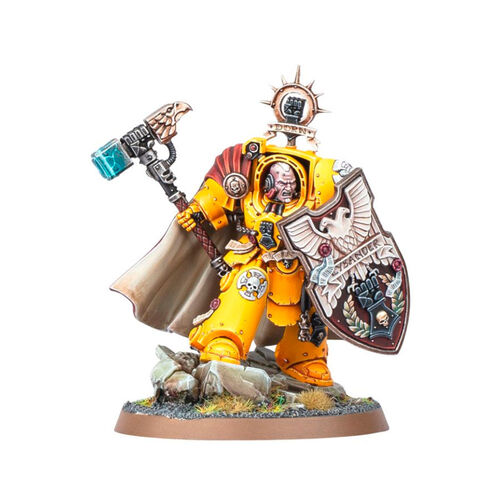 Darnath Lysander atraviesa a sus enemigos como un buque de guerra surcando mares tempestuosos. Sostiene en alto su escudo de tormenta, Muralla, mientras golpea con el Puño de Dorn, y cada impacto de su martillo convierte a sus enemigos en una pasta viscosa, haciendo saltar por los aires filas enteras de guerreros. Y todo con una mirada impasible y una determinación inquebrantable.