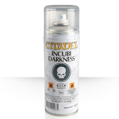 El Spray Incubi Darkness está diseñado para imprimar todas las miniaturas Citadel. Cuando se aplica, les da un color base uniforme de manera rápida y eficaz.