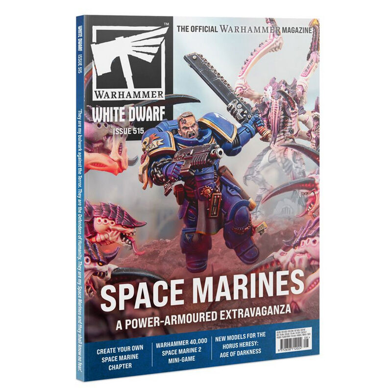 Each copy of White Dwarf 515 also comes with a cardboard insert containing a double-sided card featuring the scenarios of the month for Warhammer 40,000 and Warhammer Age of Sigmar, a Space Marines Transfer Sheet containing 442x transfers, an A2 poster featuring Space Marine Armour Marks on one side and Warhammer 40,000: Mechanicus II on the other, and 8x double-sided cards for the Space Marine Operations mini-game.