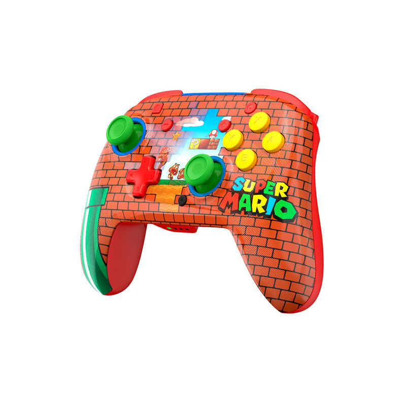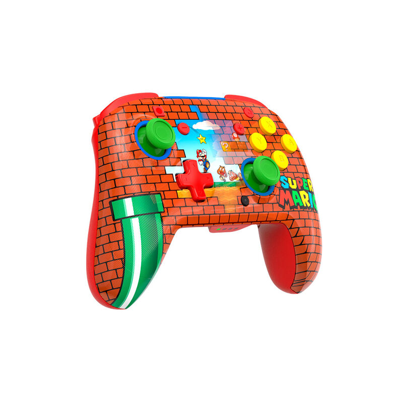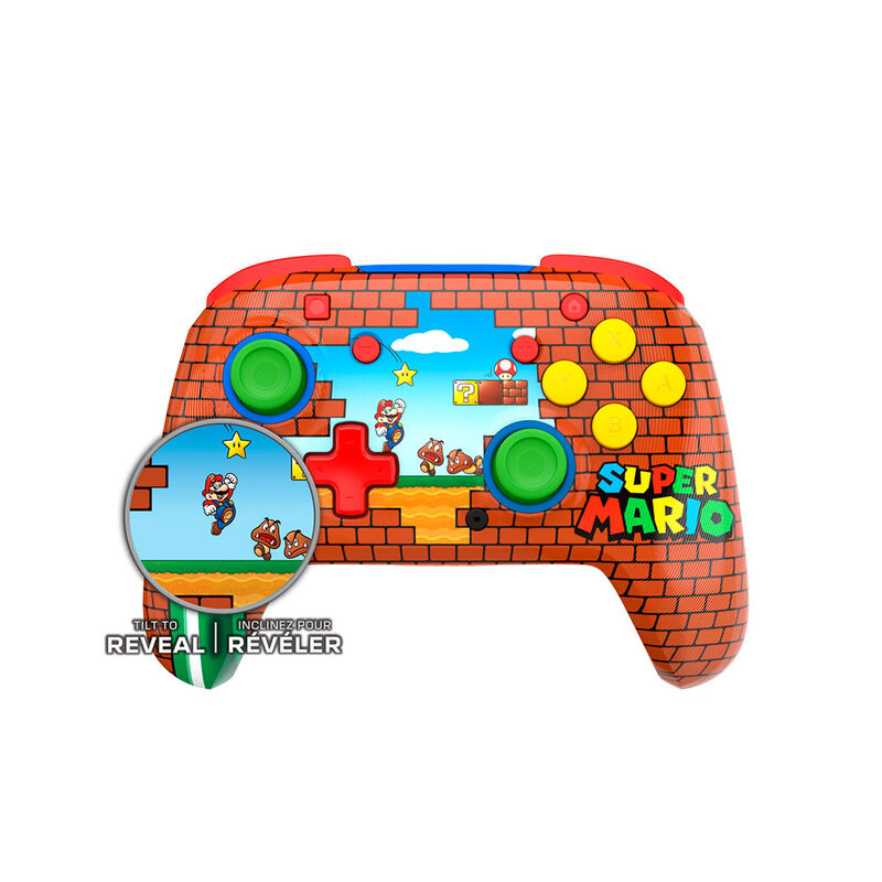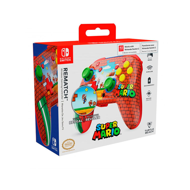 Rompe unos bloques con el mando inalámbrico Ladrillos de Mario Rematch para Nintendo Switch™, Nintendo Switch™ Lite y Nintendo Switch™ modelo OLED. Este mando también funciona con Nintendo Switch™ 2. Botón C no disponible. Con un diseño lenticular que cambia a medida que te mueves, se muestran dos llamativas imágenes de Mario con temática de ladrillos que añaden energía y movimiento a cada sesión.